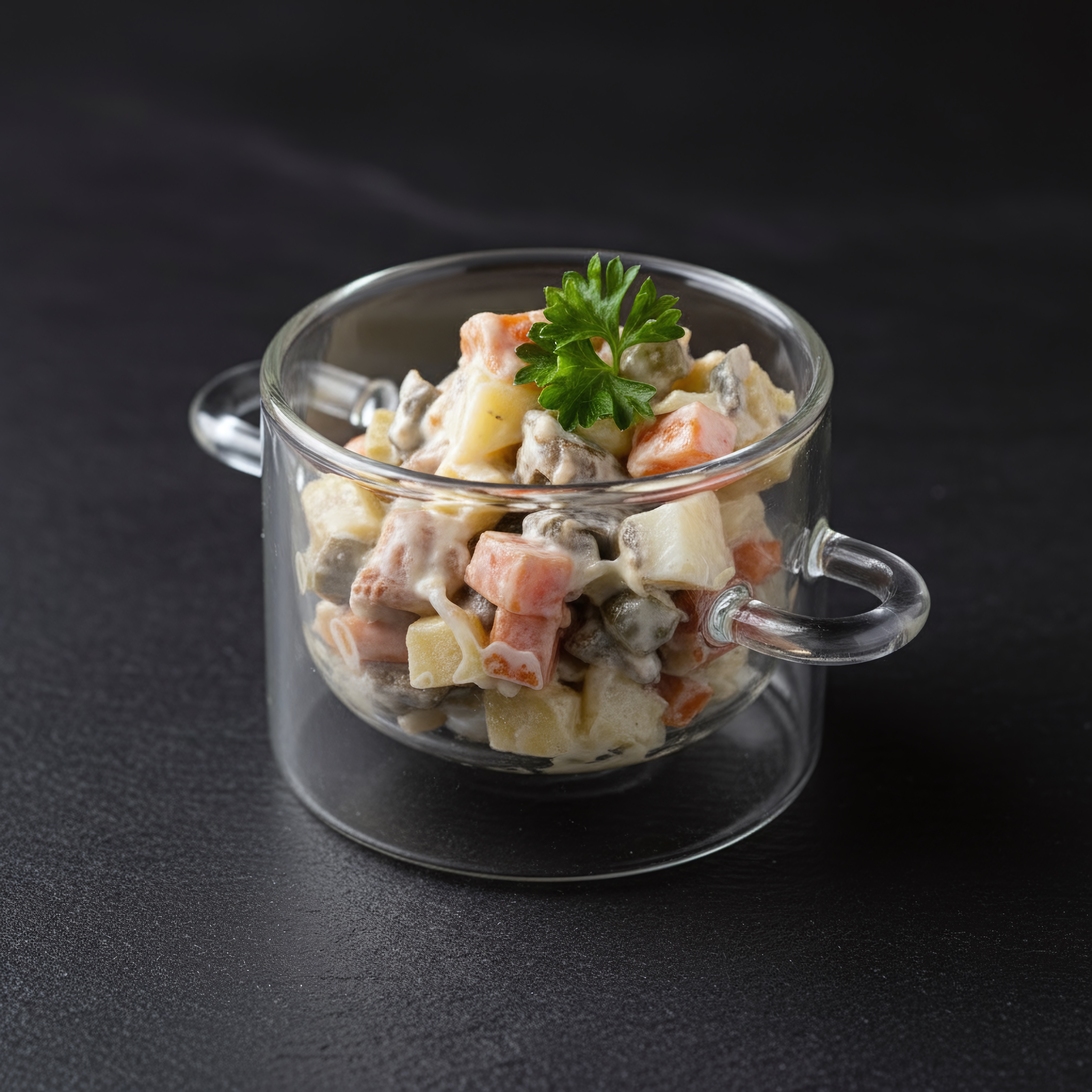 Состав: Отварные овощи /картофель, морковь/, яйцоо, филе курицы, маринованный огурец, майонез, сметана, свежаязелень